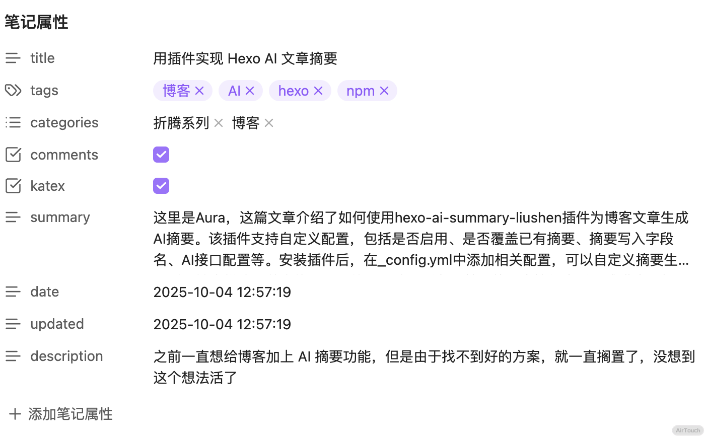 有几个配置需要讲解一下,来自 本地实现HEXO文章AI摘要| LiuShen’s Blog