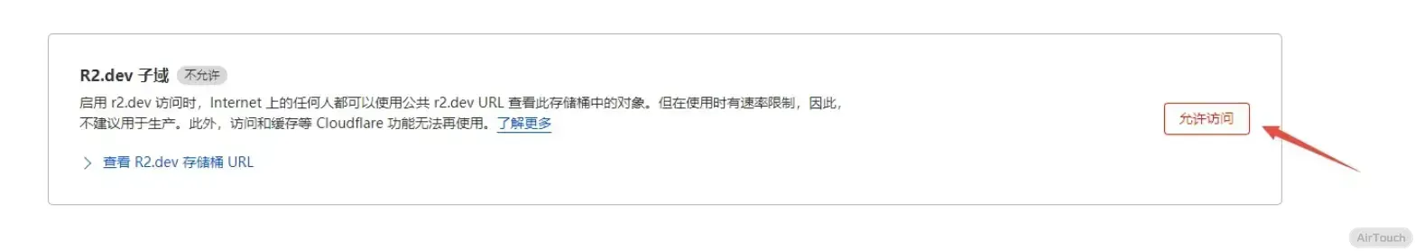 到设置页面之后往下拉,找到 R2.dev 子域 ,点击允许访问。