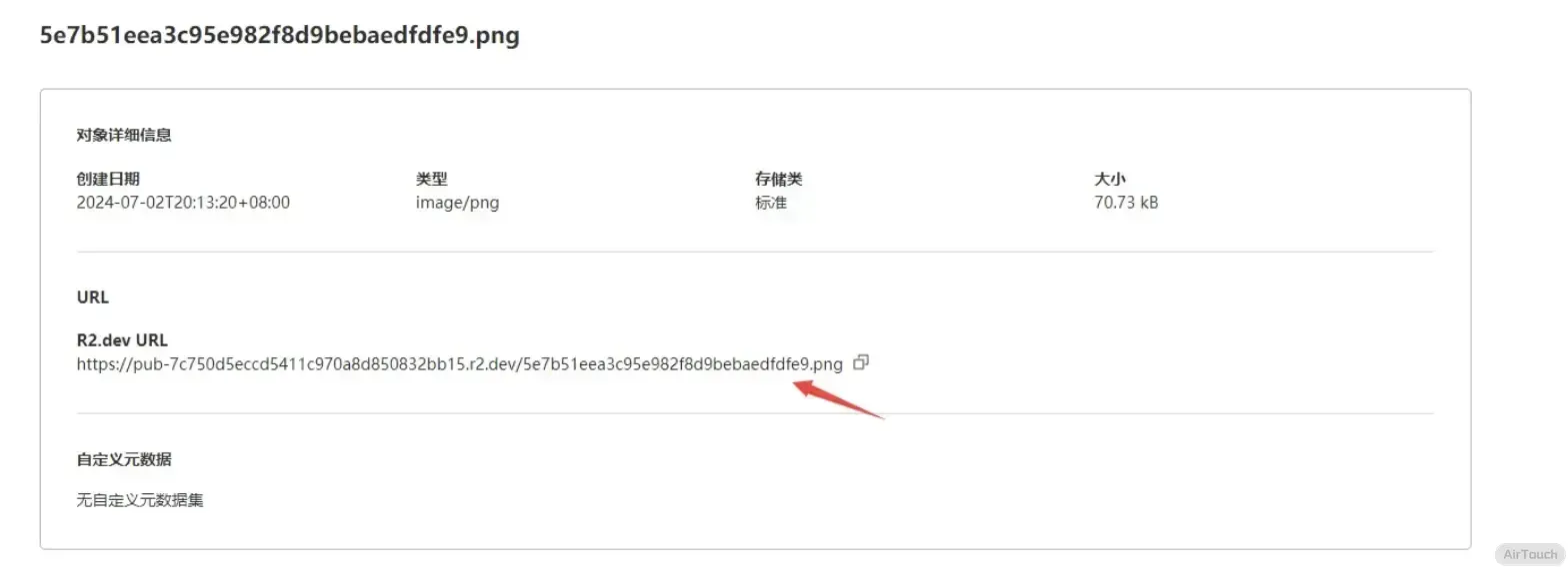 应用密钥 ID填之前创建 API 令牌时获得的访问密钥 ID应用密钥填之前创建 API 令牌时获得的机密访问密钥桶填之前的存储桶的名称文件路径按照个人喜好填写,这里我填的是PicGo/{fullName}权限填public-read地区填auto自定义节点填https://<帐户 ID>.r2.cloudflarestorage.com,注意这里的<帐户 ID>可在R2页面获得。