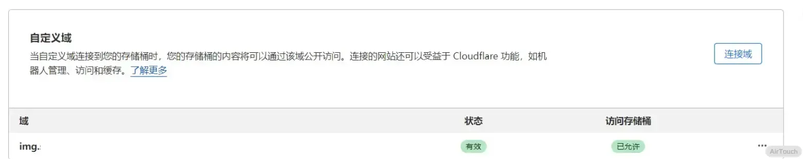 Cloudflare 会自动帮你添加 DNS 记录,点击连接域,等几分钟,刷新页面,状态有效就成功了。这样我们的图片就有了自定义域名的链接。