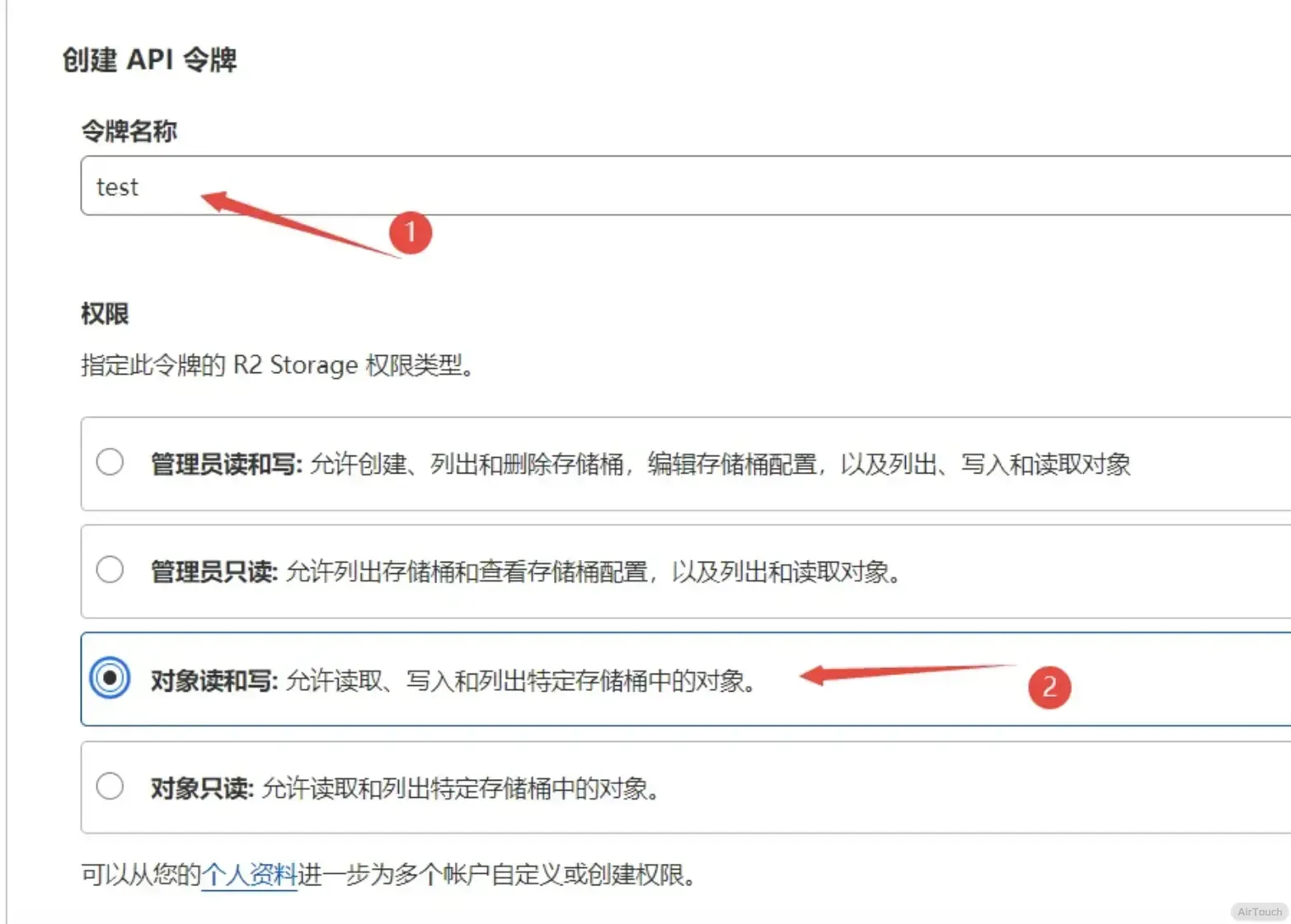 自定义令牌名,然后权限选择对象读和写,其他不变,最后下拉点击创建 API 令牌即可