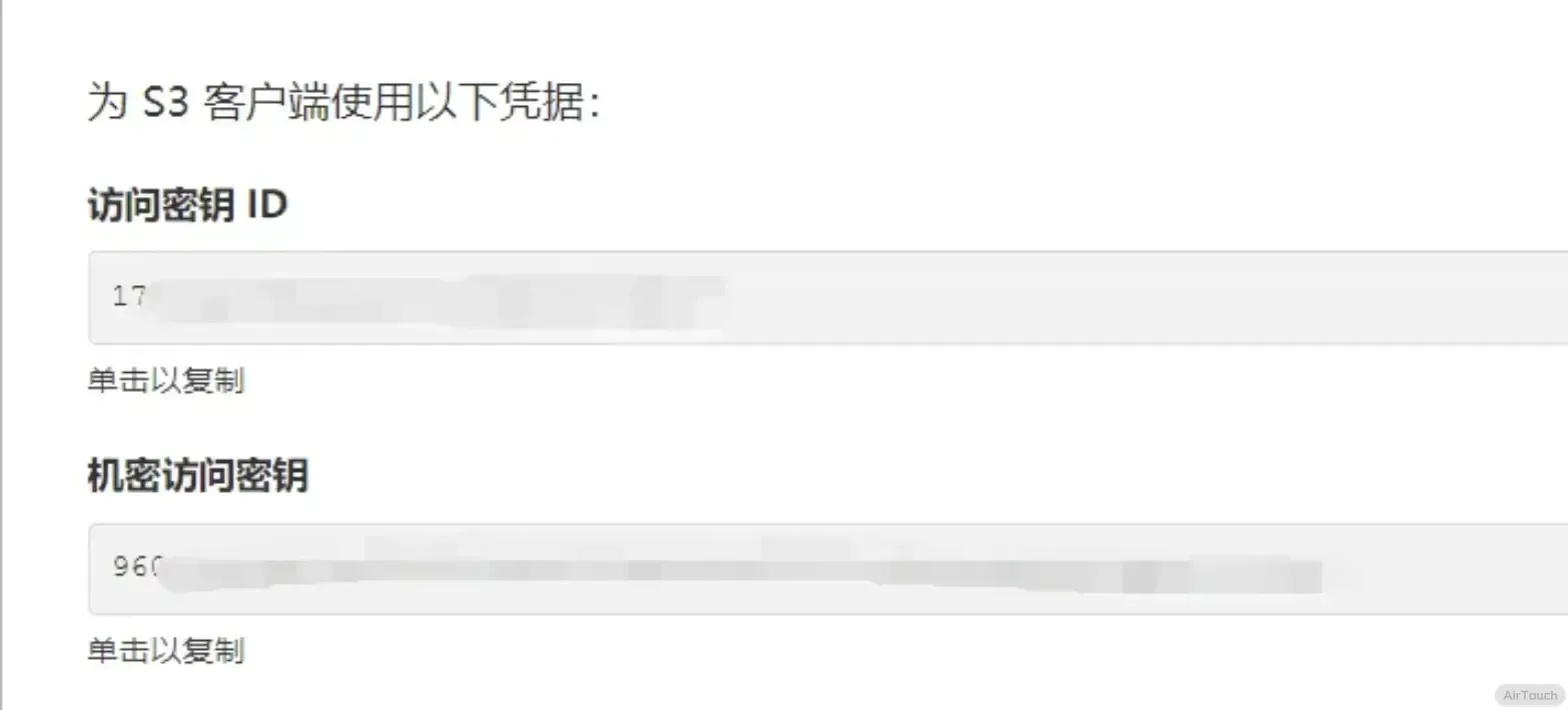 注意完成上面步骤后,在新的页面中我们要将访问密钥 ID和机密访问密钥记下