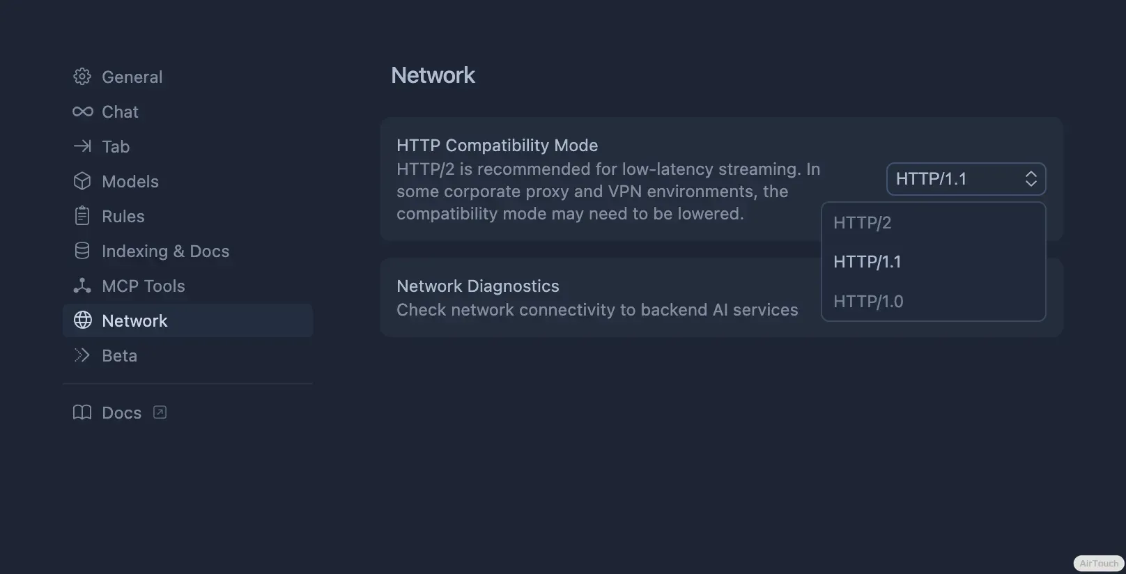 打开 Cursor Settings,左侧找到 Network,把 HTTP Compatibility Mode 改为 HTTP/1.1