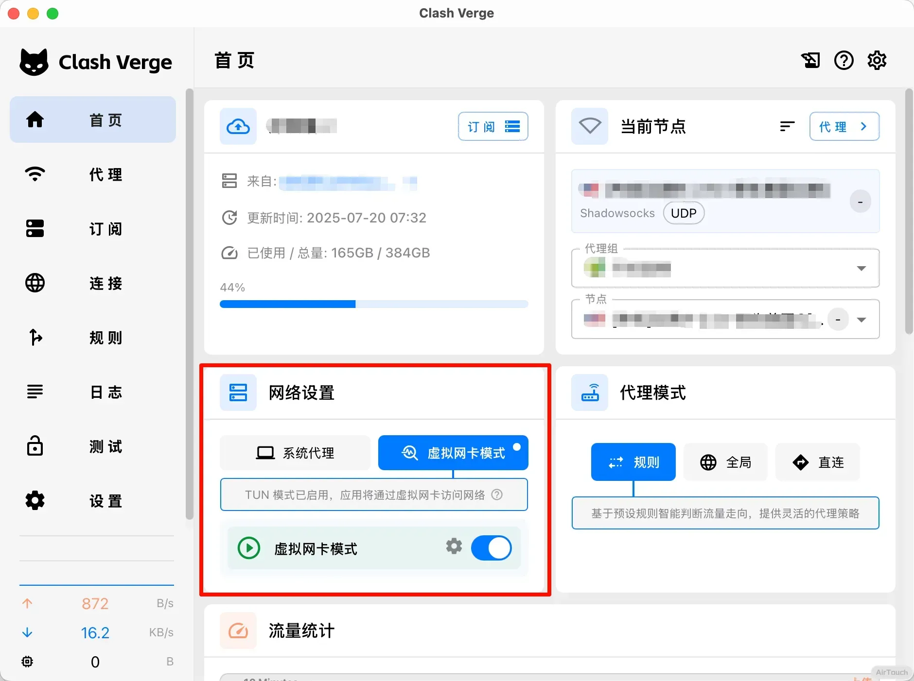 打开你的代理软件,打开 TUN 模式,也就是虚拟网卡模式
