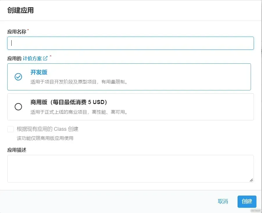 LeanCloud 国际版并进入 控制台 - 点击左上角 创建应用 并起一个你喜欢的名字 (请选择免费的开发版):