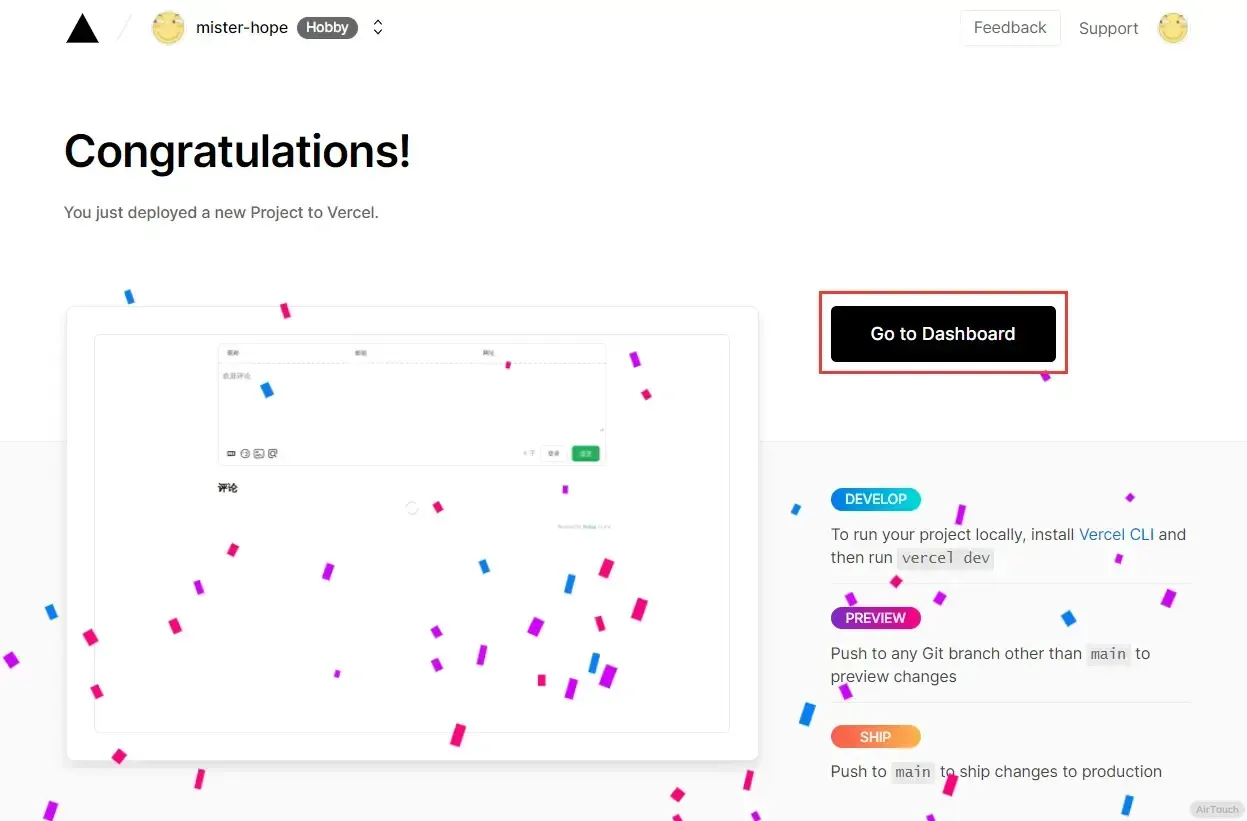 - 点击上方按钮,跳转至 Vercel 进行 Server 端部署。