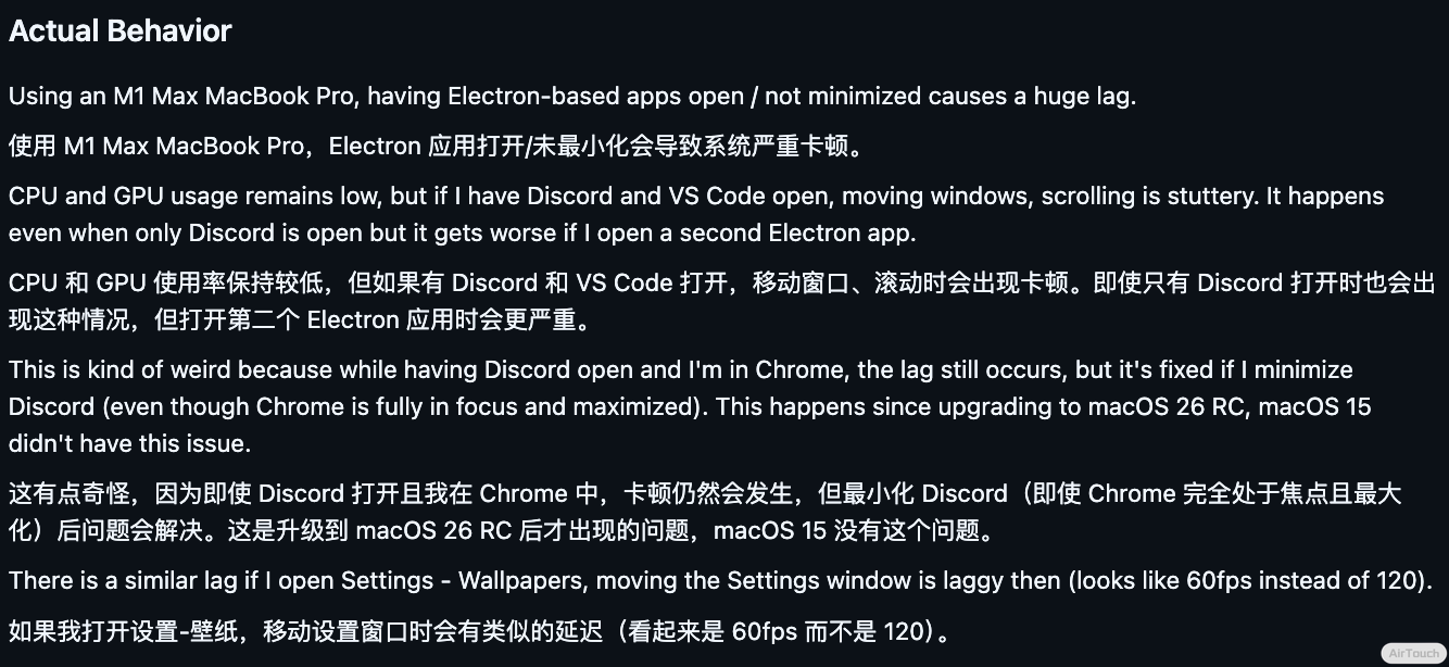 Electron 的仓库上有个 Issues 的反馈 Electron-based apps cause a huge system-wide lag on macOS 26 #48311