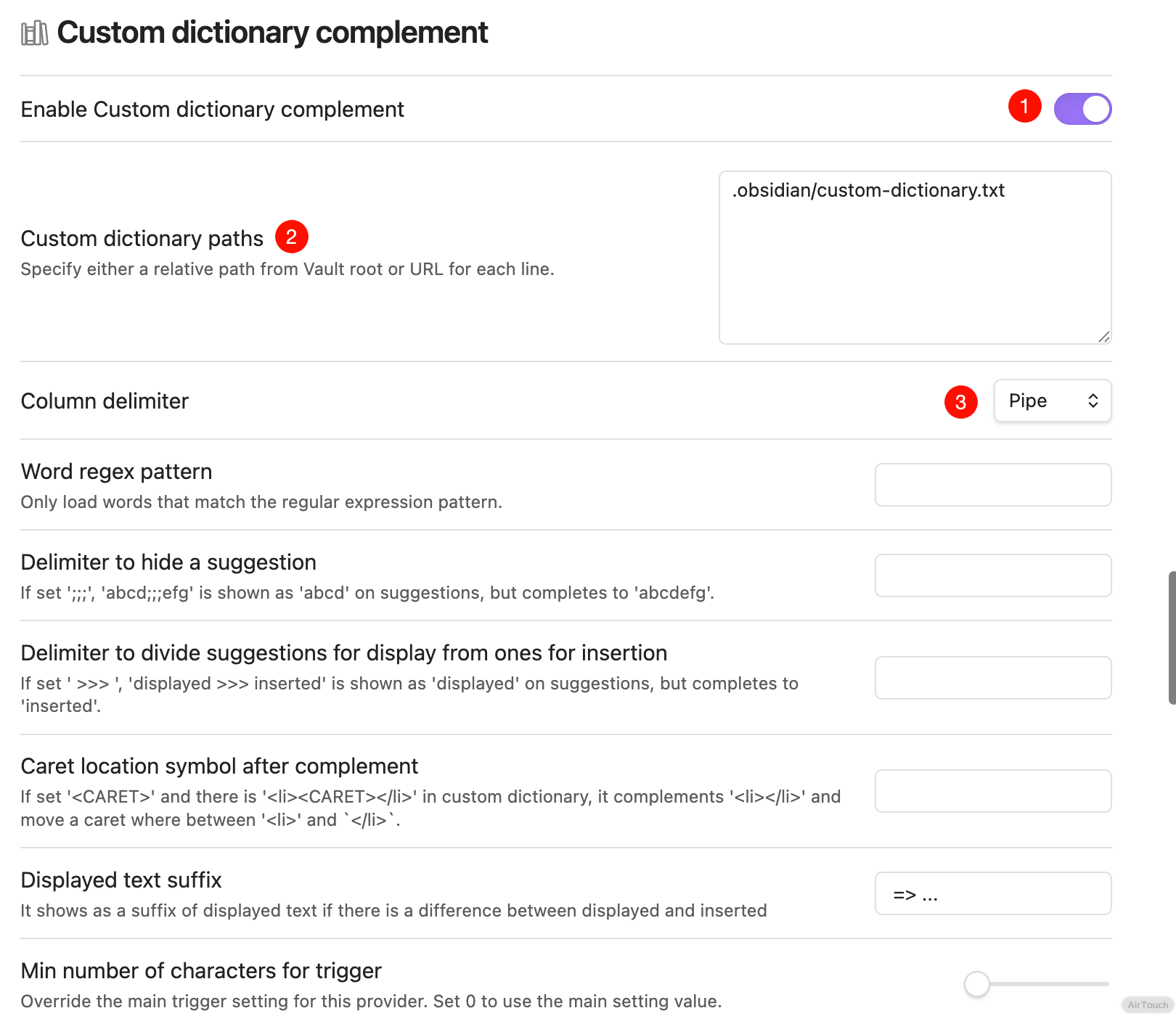 找到 Custom dictionary complement 打开,在下方的 Custom dictionary paths 中填上你配置文件的路径(相对路径),在把下方的 Column delimiter 改为 Pipe