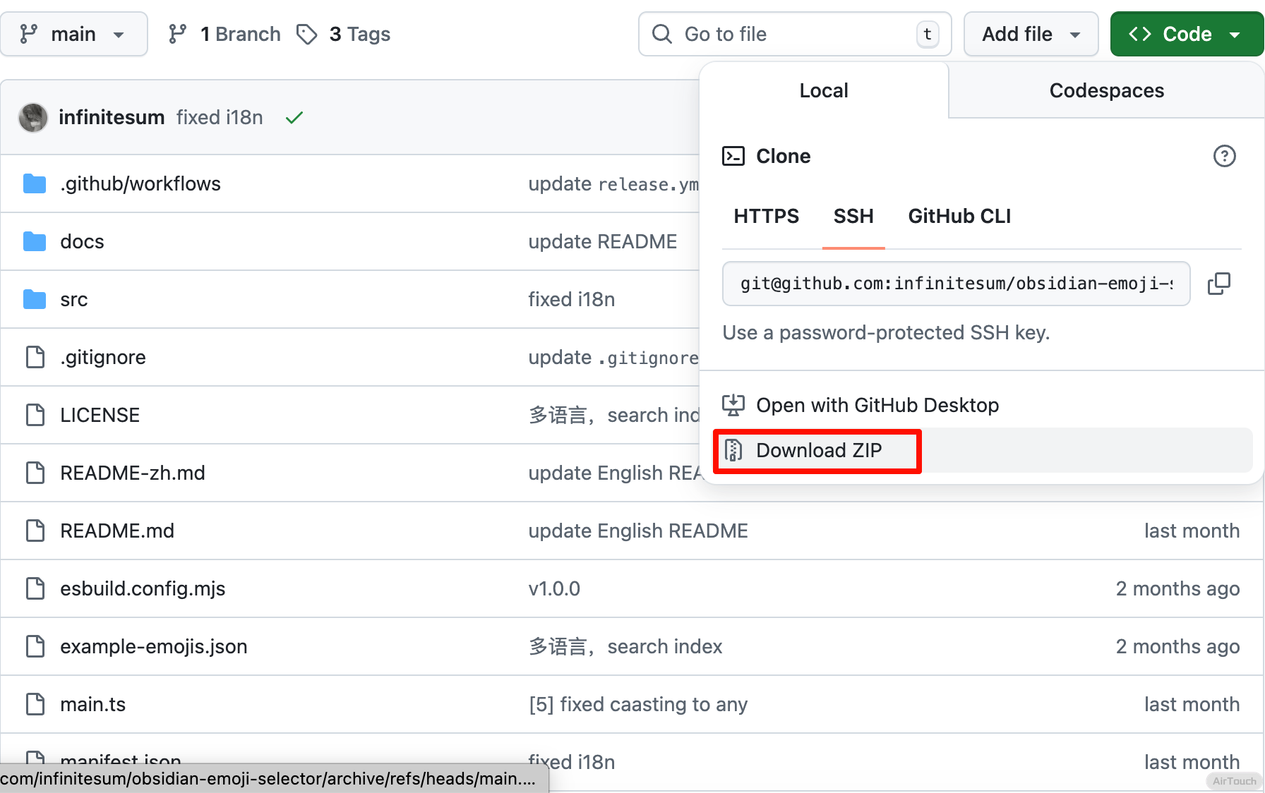 这个插件需要自己安装,先点 Code -> Download ZIP 下载下来
