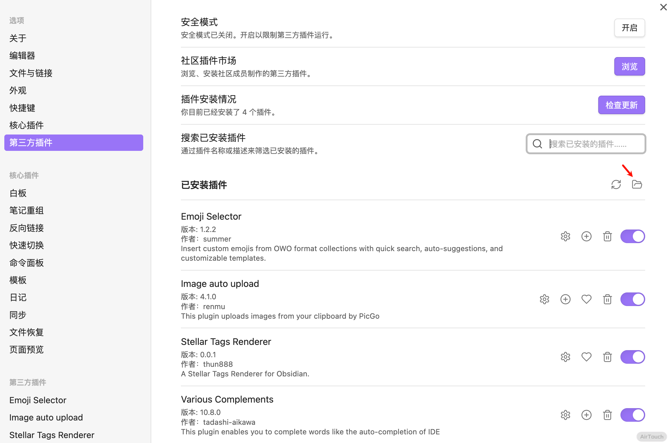 接着打开 Obsidian 的第三方插件设置,点击小文件夹,进入插件目录,把你的文件夹拖进去