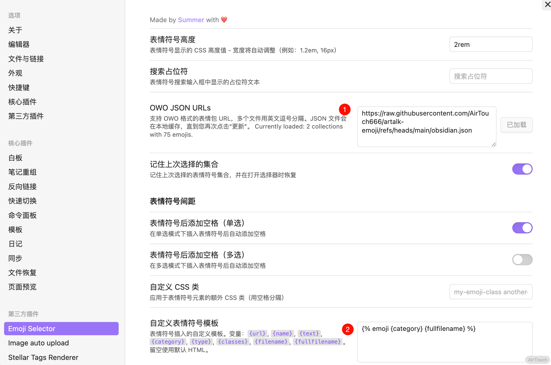 然后去插件的设置,OWO JSON URLs 填上 json 文件,格式和 twikoo 评论的一样,这里不再赘述,有问题可以去评论区问,下面的自定义表情符号模板 填上 {% emoji {category} {fullfilename} %}