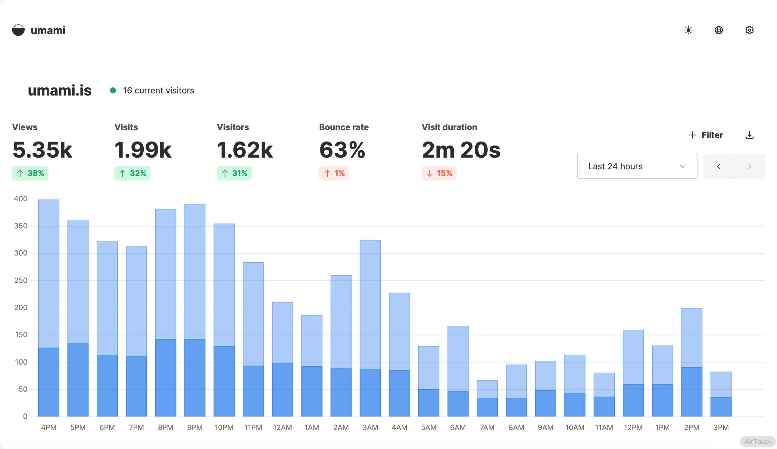 它能精准统计你最关心的数据:访问量、页面浏览量、访客来源和设备信息等,并以清晰直观的图表呈现,让你快速掌握网站表现。与许多笨重复杂的统计工具不同,Umami界面非常干净,没有令人眼花缭乱的复杂报告,专注于提供真正有用的核心指标。