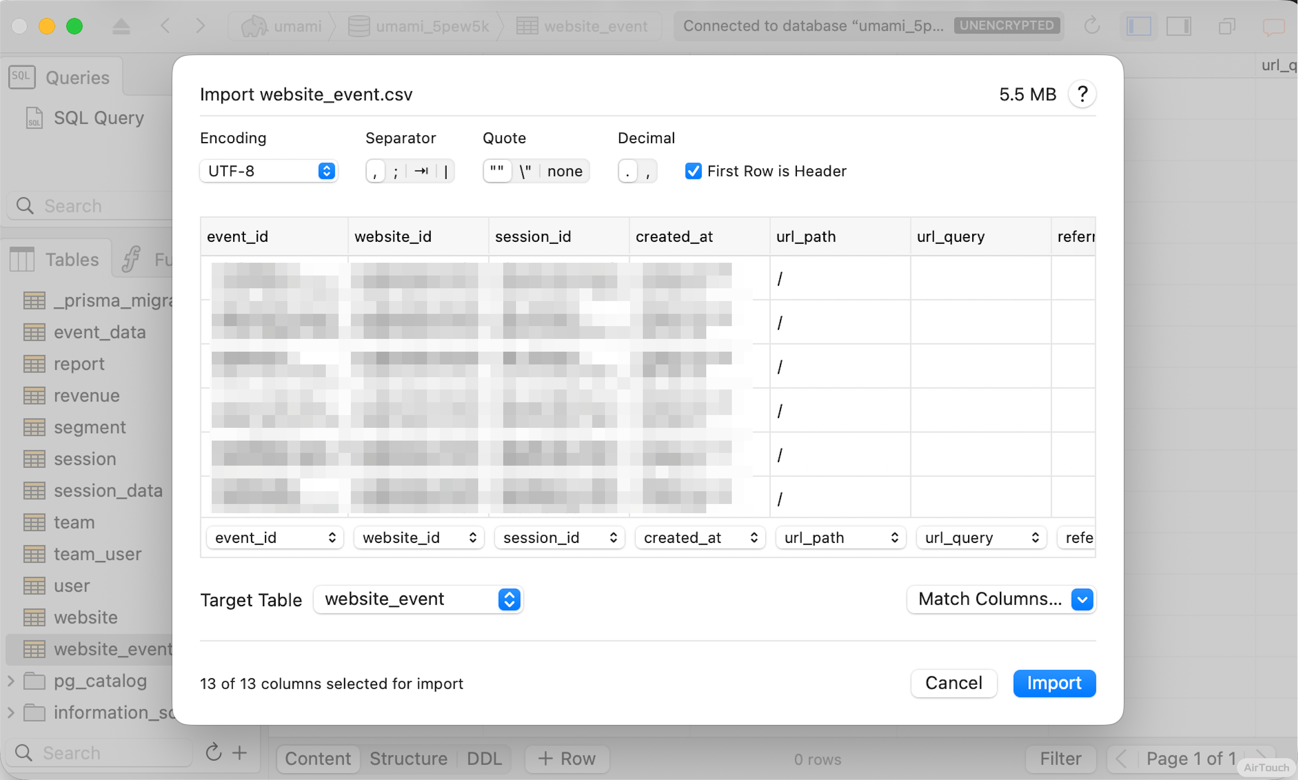 在 website-event 导入 website-event.csv