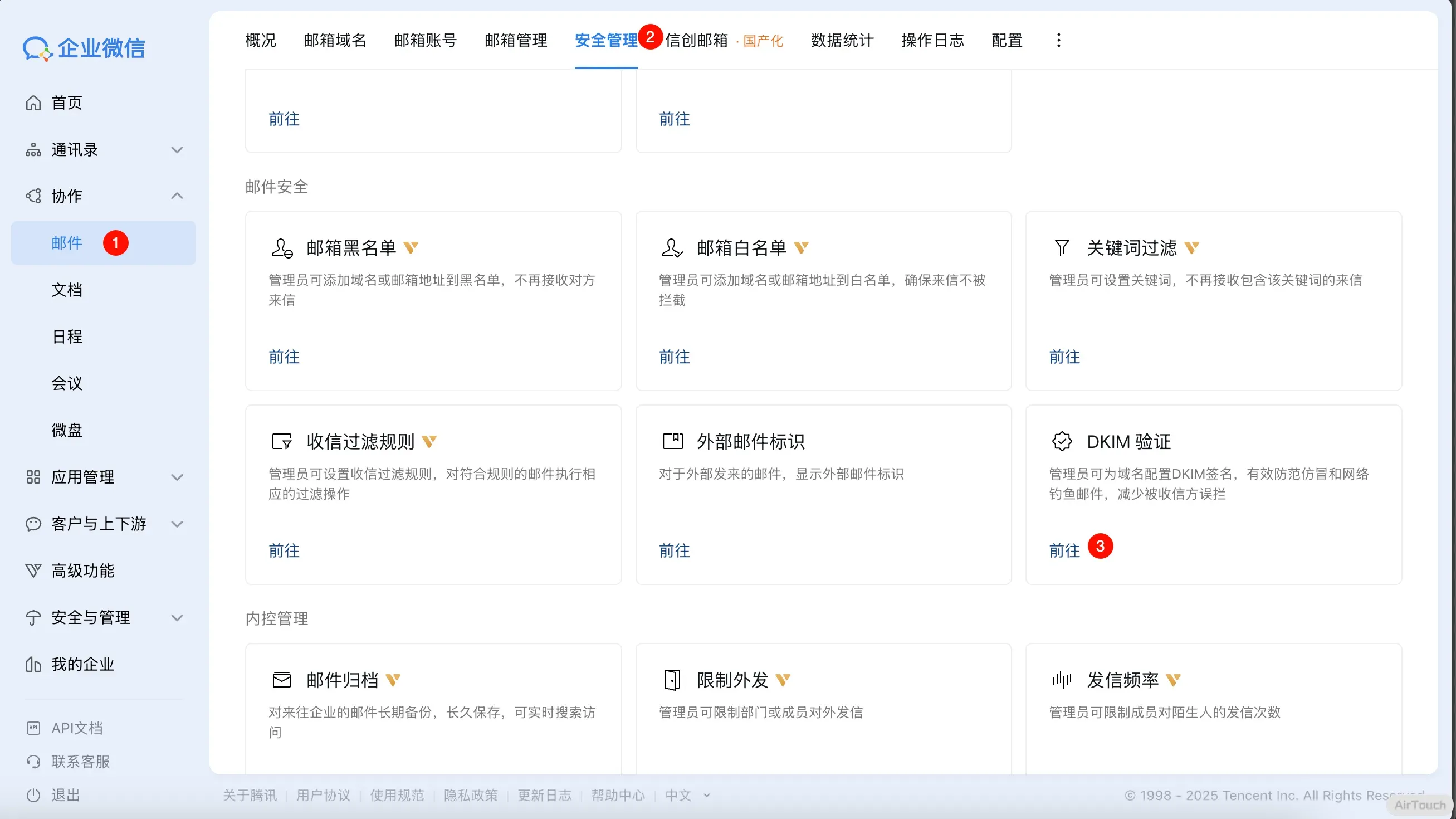 所以接下来要配置 dkim,在网页中登录企业微信的管理员账号,按下图操作
