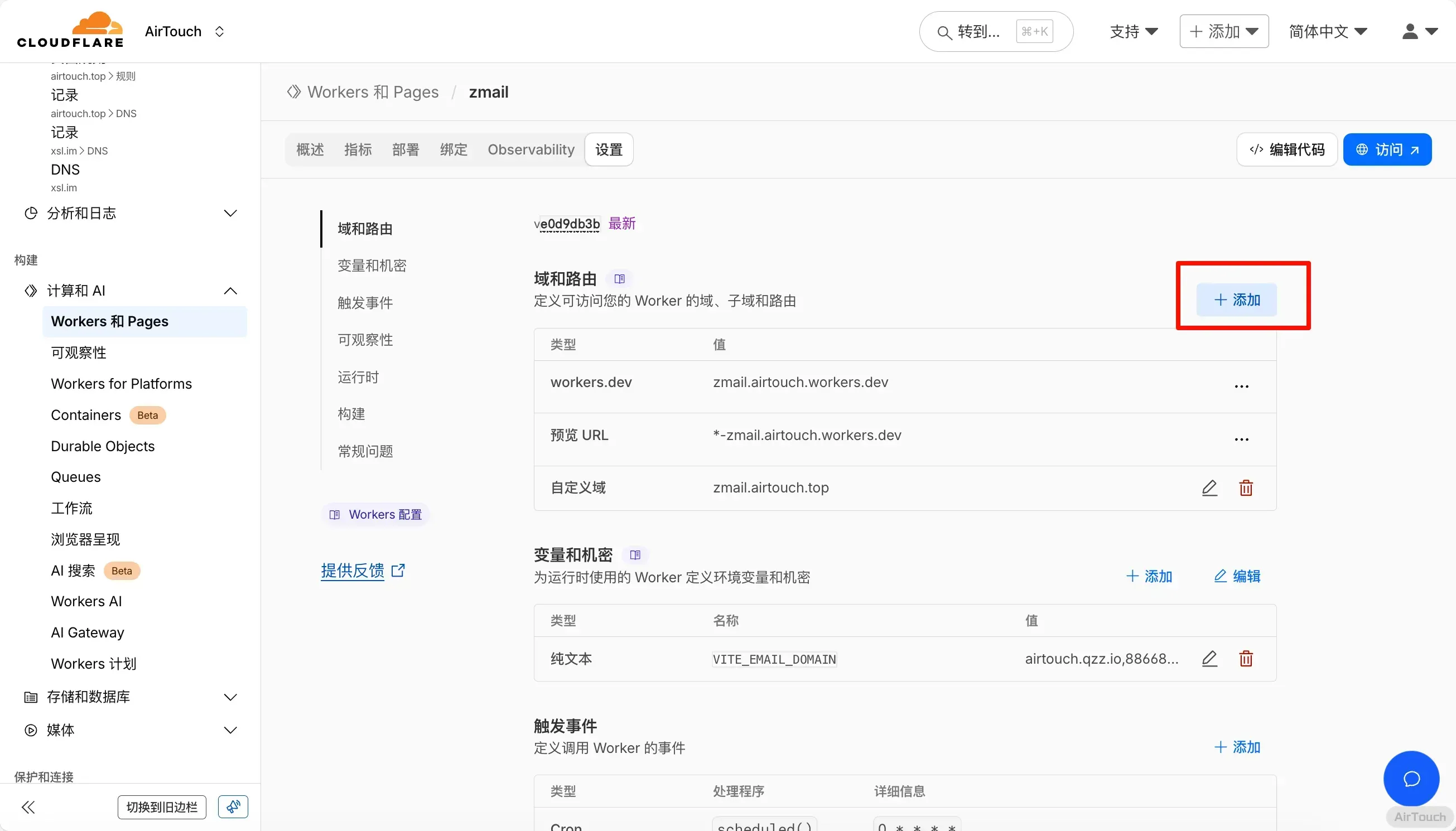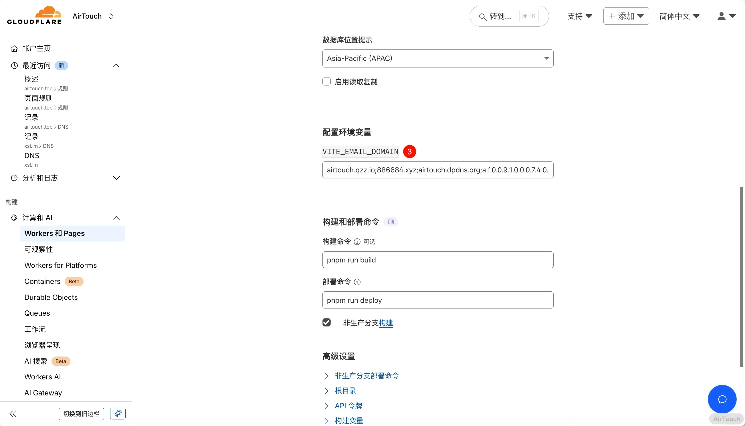 然后填上 VITE_EMAIL_DOMAIN,就是临时邮箱使用的域名,多个用 , 分割(图中写错了,别照抄)