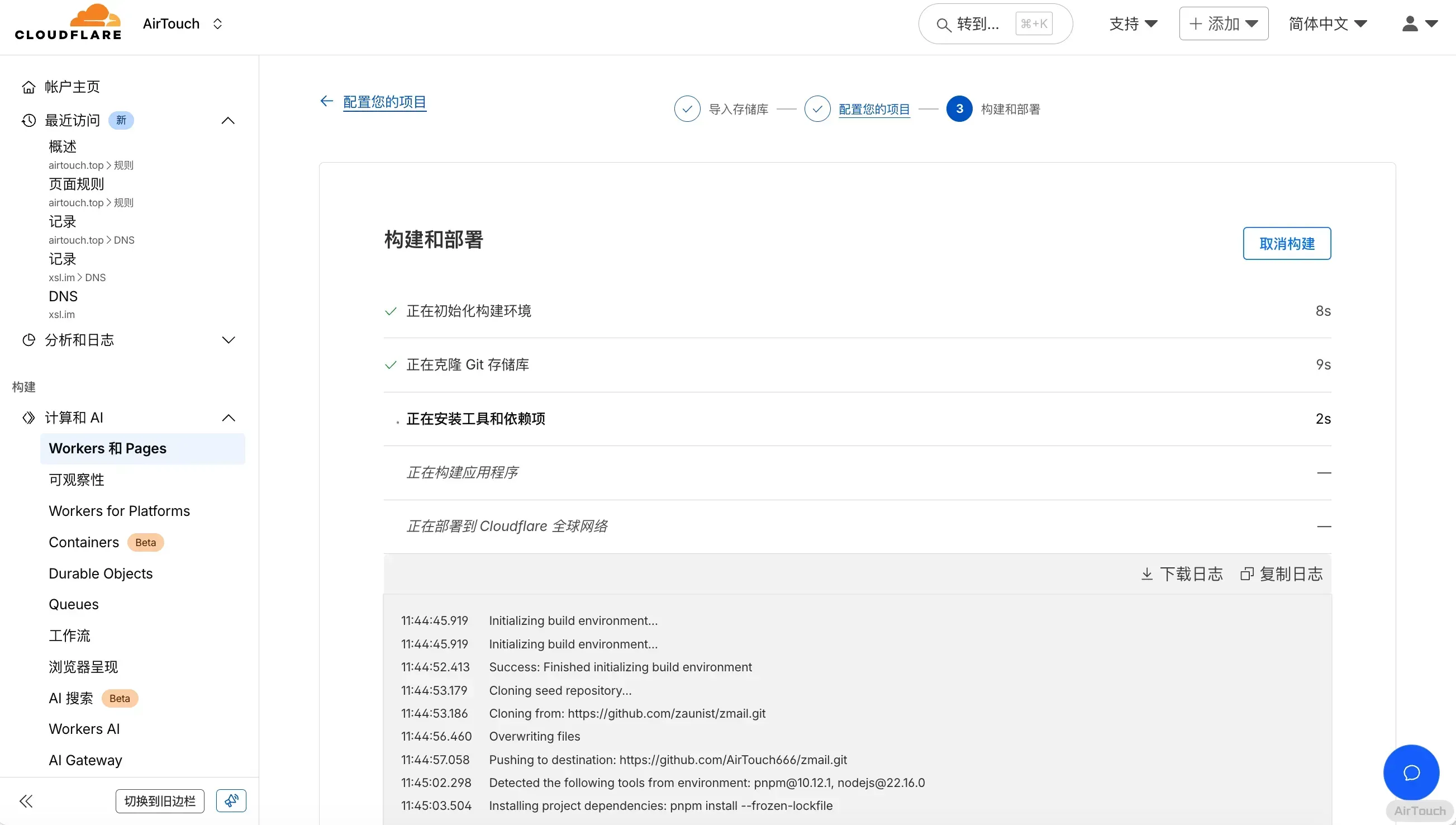 然后点击部署,Cloudflare 就自己开始部署了
