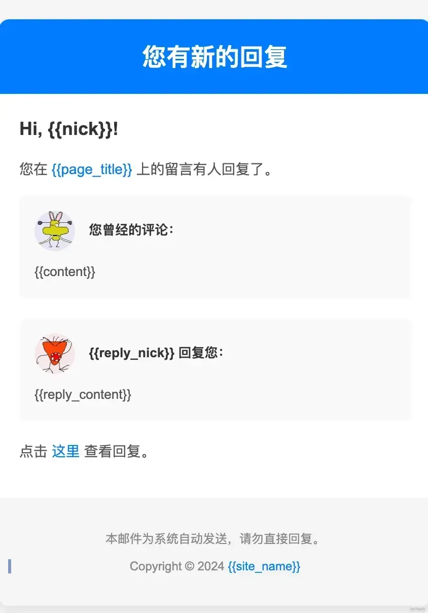 本邮件为系统自动发送,请勿直接回复邮件哦,可到博文内容回复。<br />站点地址:{{site_url}}</p>