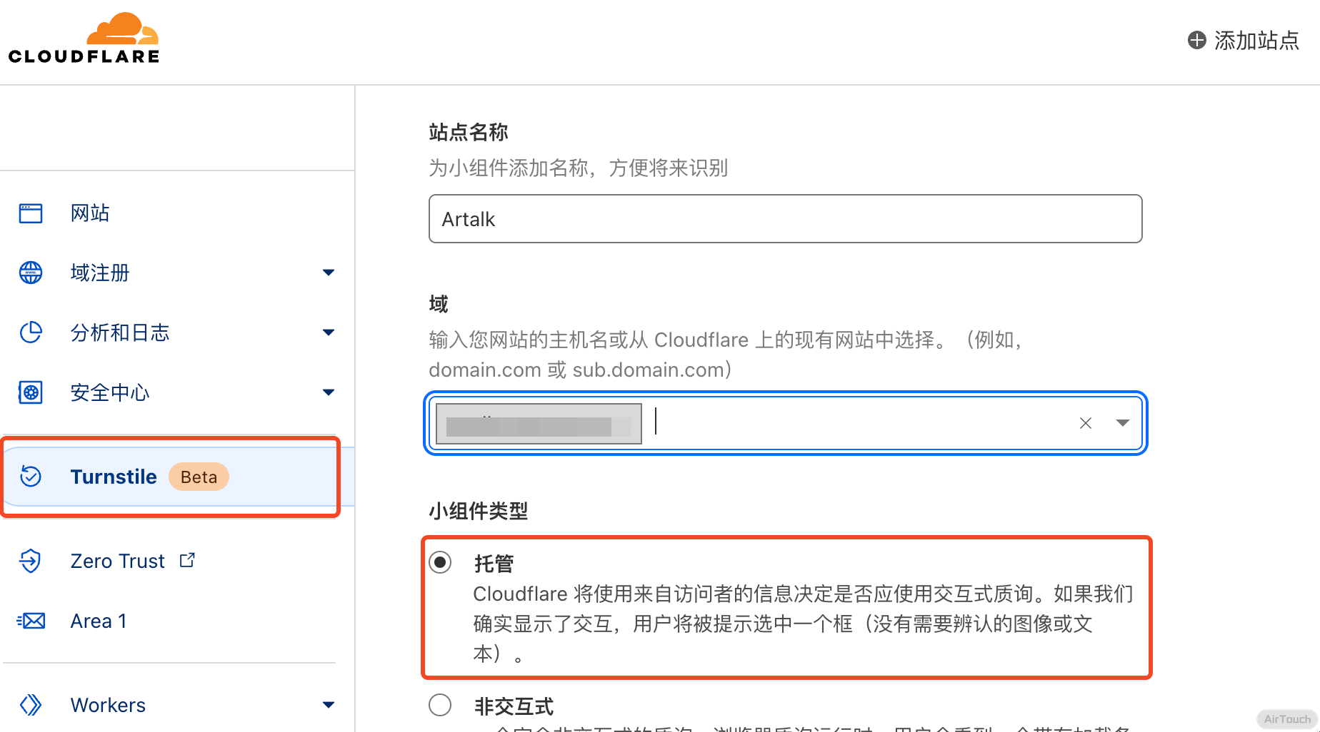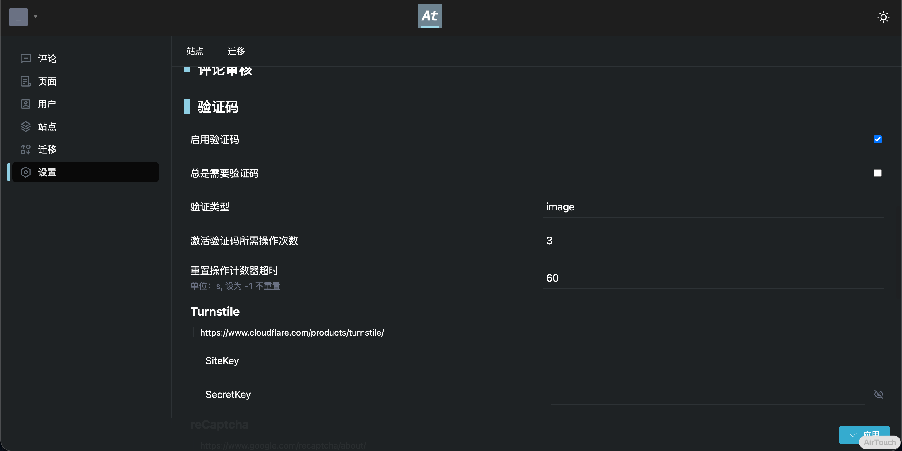 Turnstile 是 Cloudflare 推出的无感验证服务,在 Cloudflare 申请获得 site_key 和 secret_key,之后在 Artalk 控制中心设置页填入 Key 并将 captcha_type 修改为 turnstile 即可。