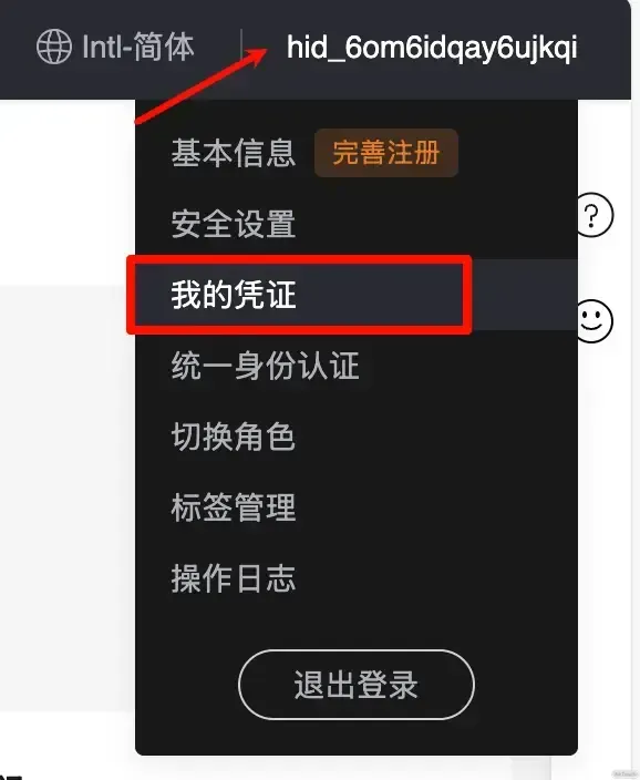 配置一下华为云的密钥,打开华为云国际,点开右上角的我的凭证
