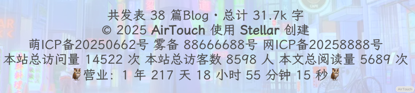 el += </div></footer>前面加上:js el += '<span class="totalcount">共发表 ' + site.posts.length + ' 篇Blog · </span><span class="post-count">总计 ' + totalcount(site) + ' 字</span>'