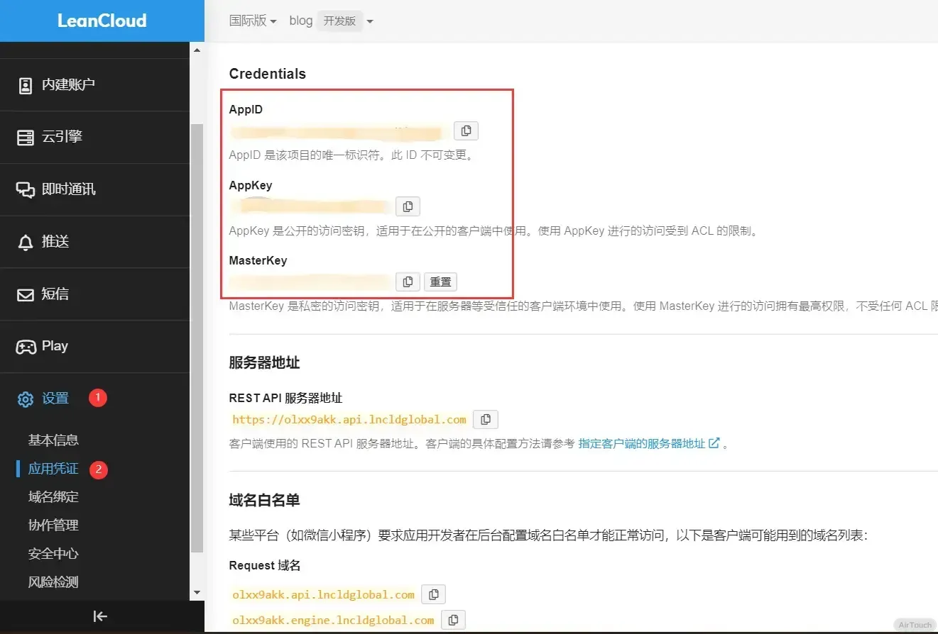 设置>应用 Key。你可以看到你的APP ID,APP Key和Master Key。请记录它们,以便后续使用。
