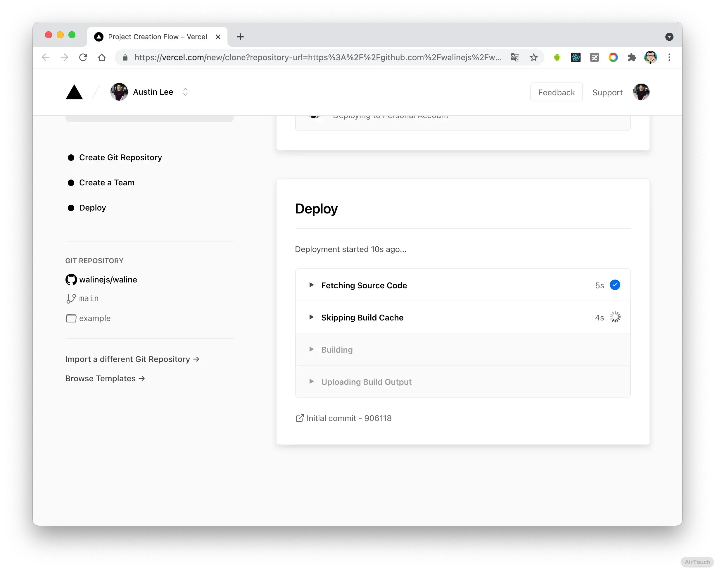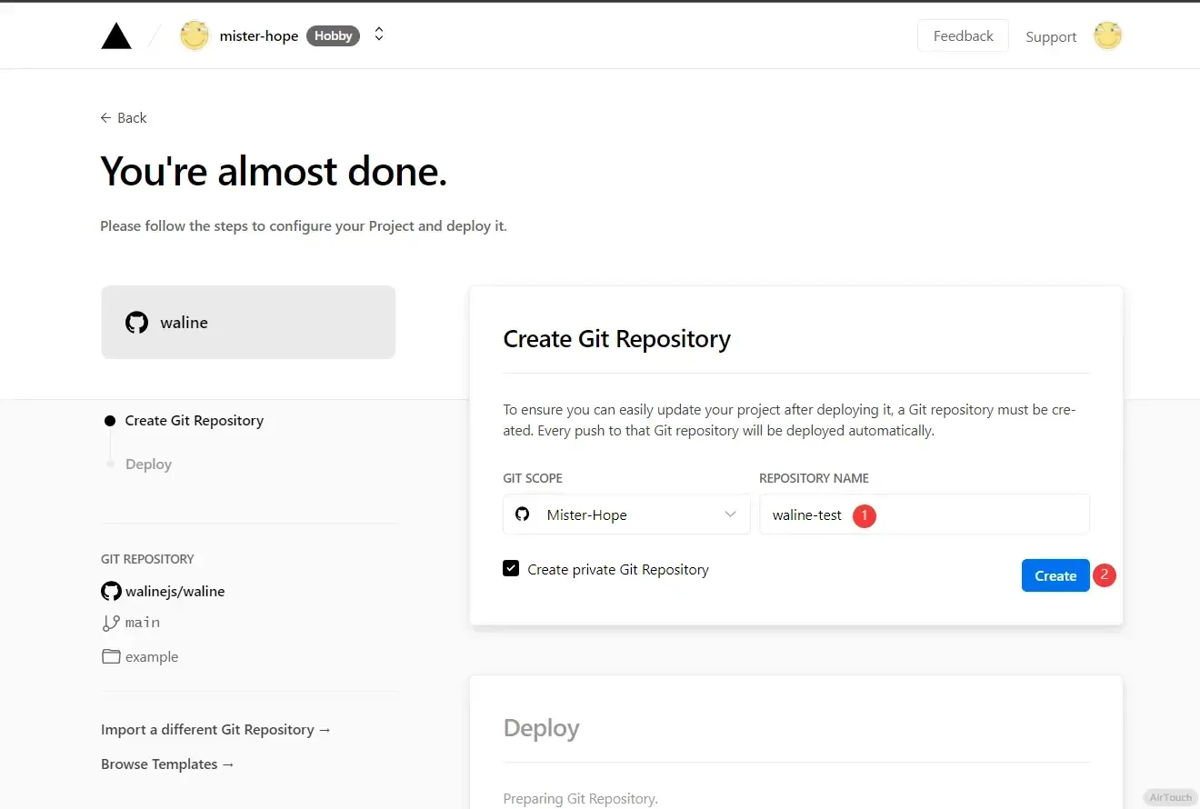 - 此时 Vercel 会基于 Waline 模板帮助你新建并初始化仓库,仓库名为你之前输入的项目名。