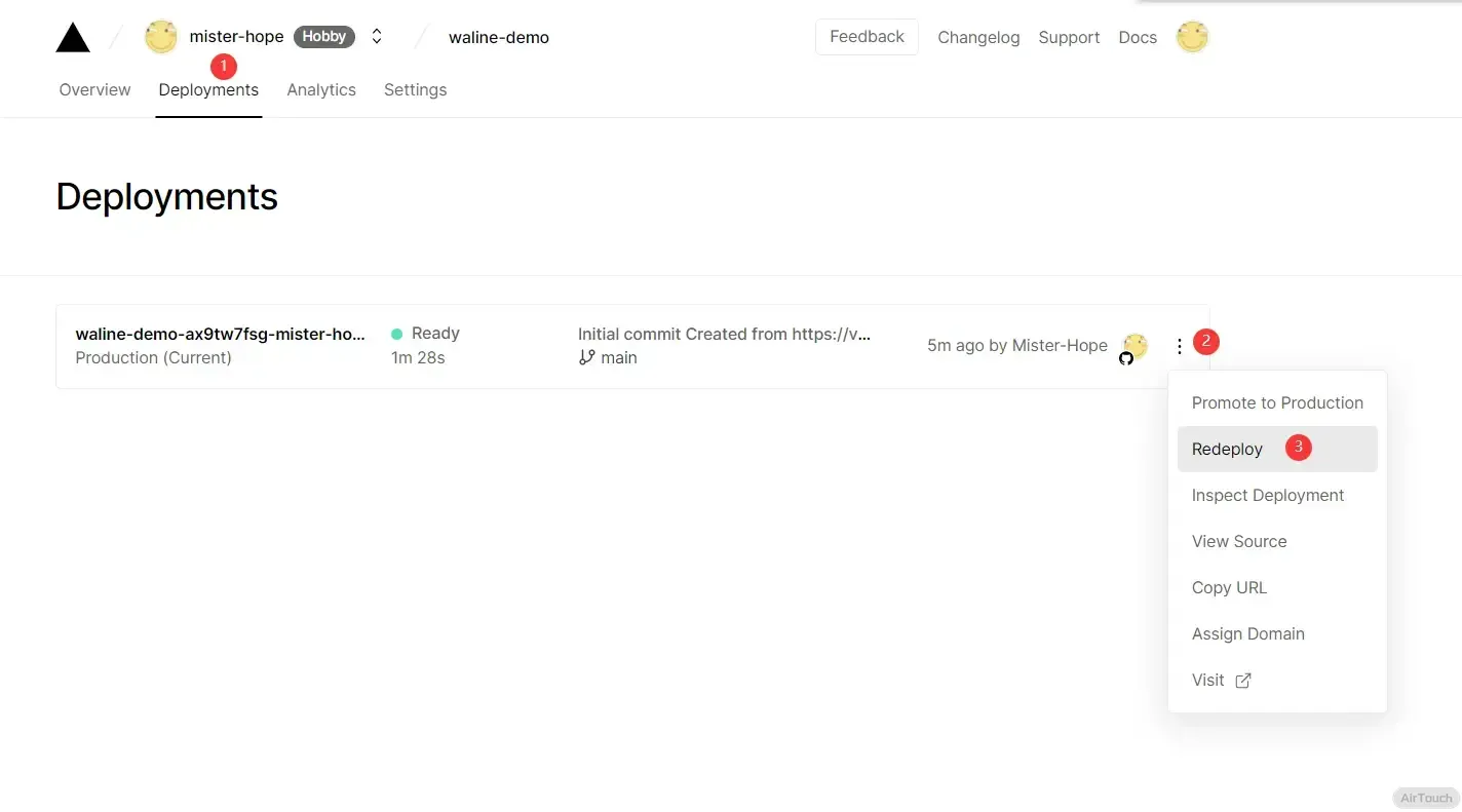 Deployments点击顶部最新的一次部署右侧的Redeploy按钮进行重新部署。该步骤是为了让刚才设置的环境变量生效。