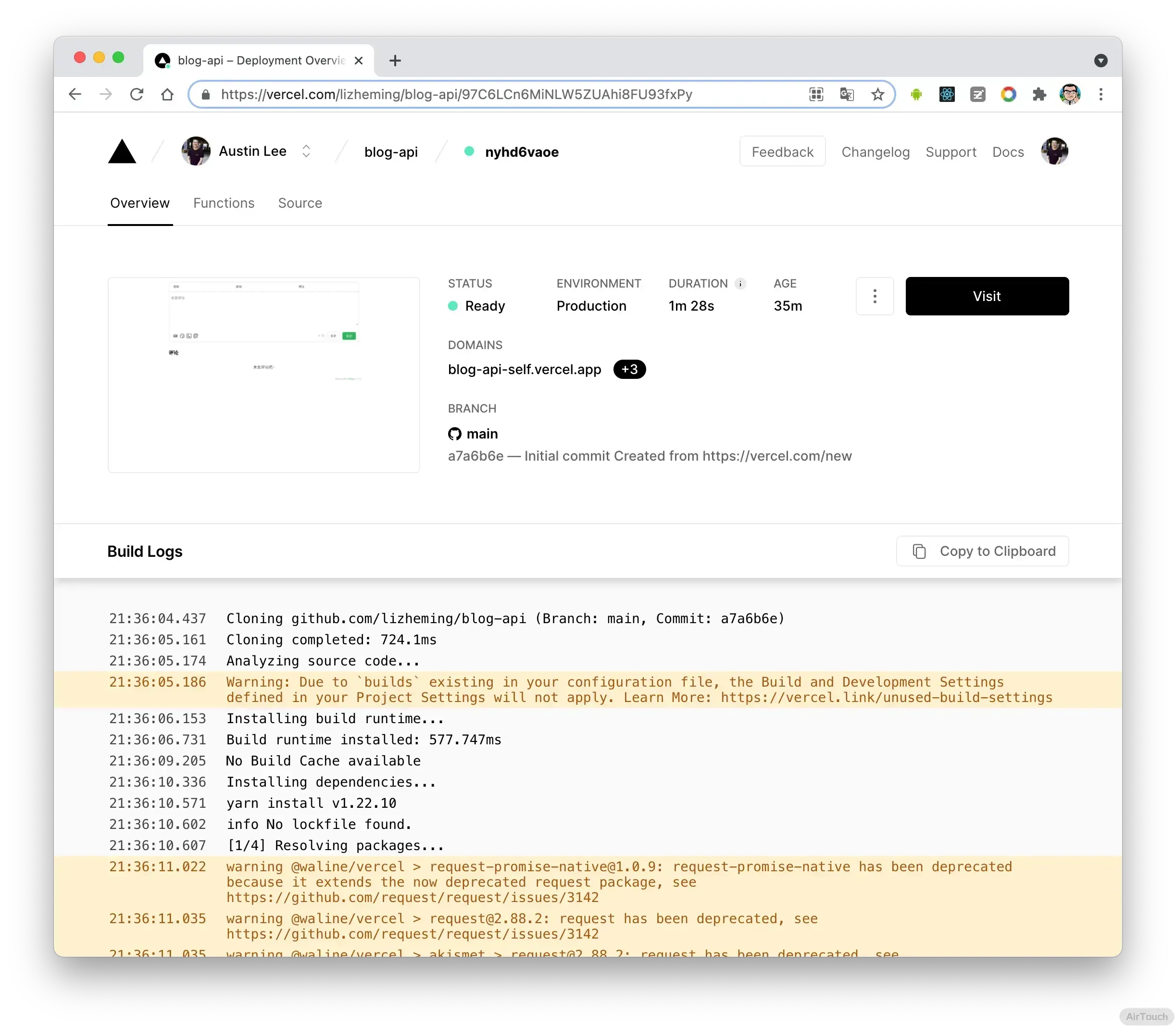 Overview界面开始部署,等待片刻后STATUS会变成Ready。此时请点击Visit,即可跳转到部署好的网站地址,此地址即为你的服务端地址。