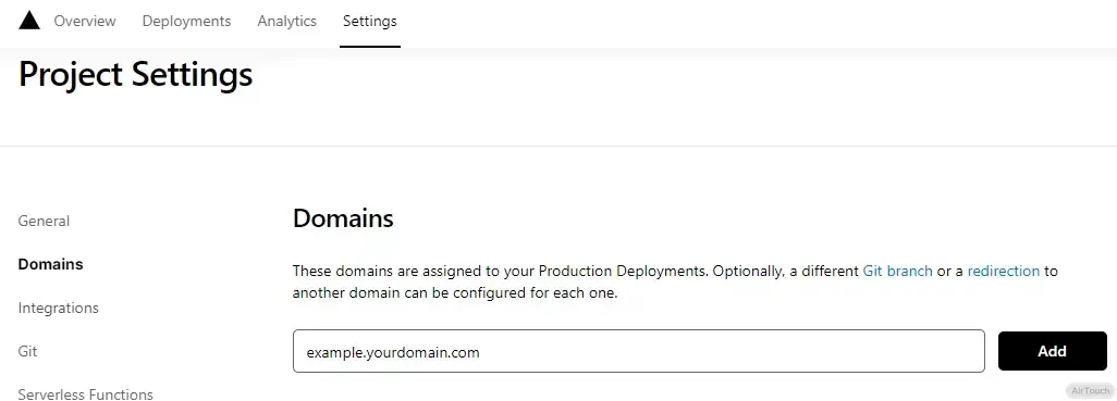 Settings-Domains进入域名配置页 - 输入需要绑定的域名并点击