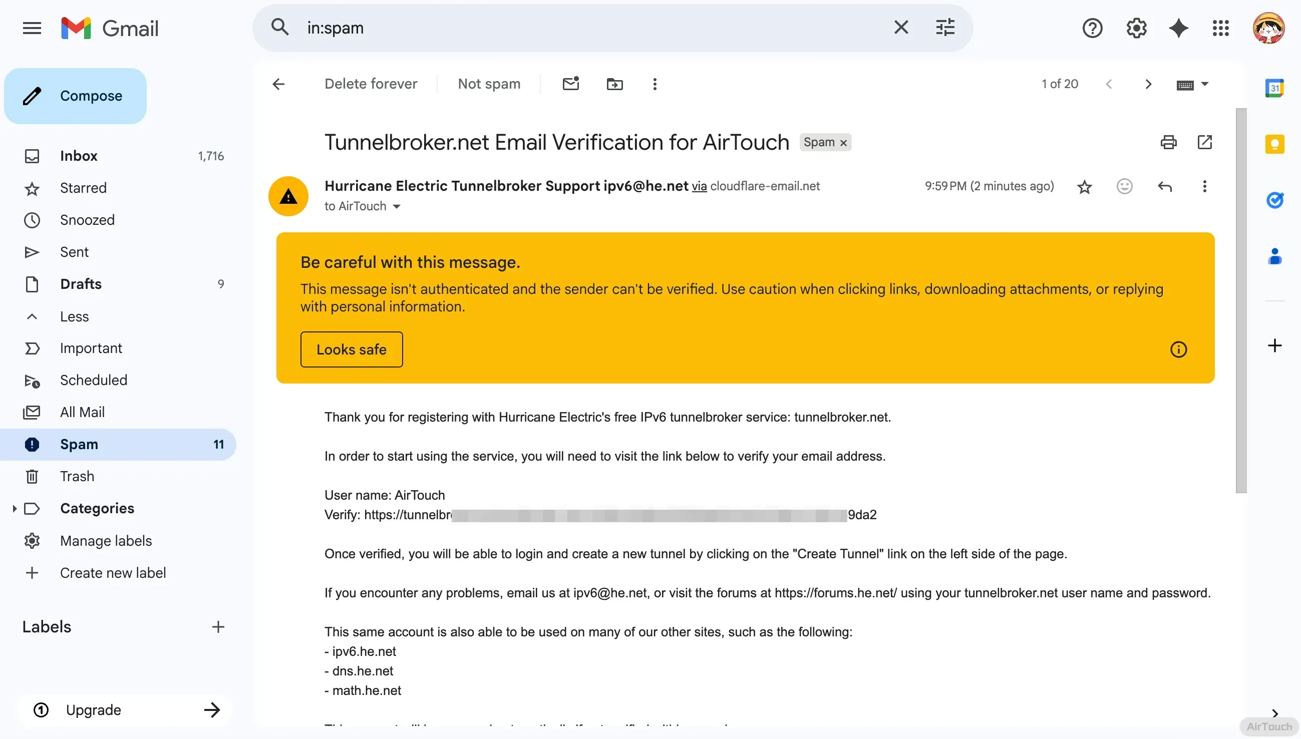 提交注册之后,tunnelbroker 会给你填写的邮箱发一封验证邮件,注意查看垃圾邮件(Gmail 直接给报 Spam 了)