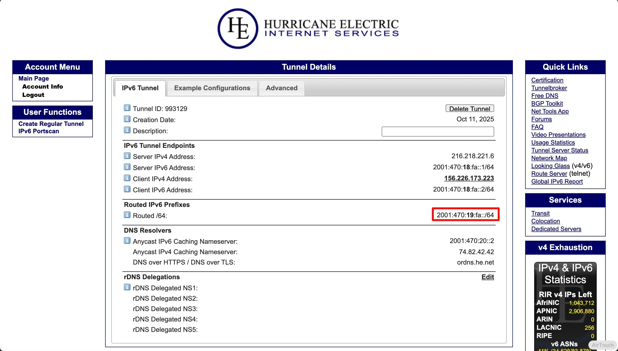 以我的 2001:470:19:fa::/64 为例