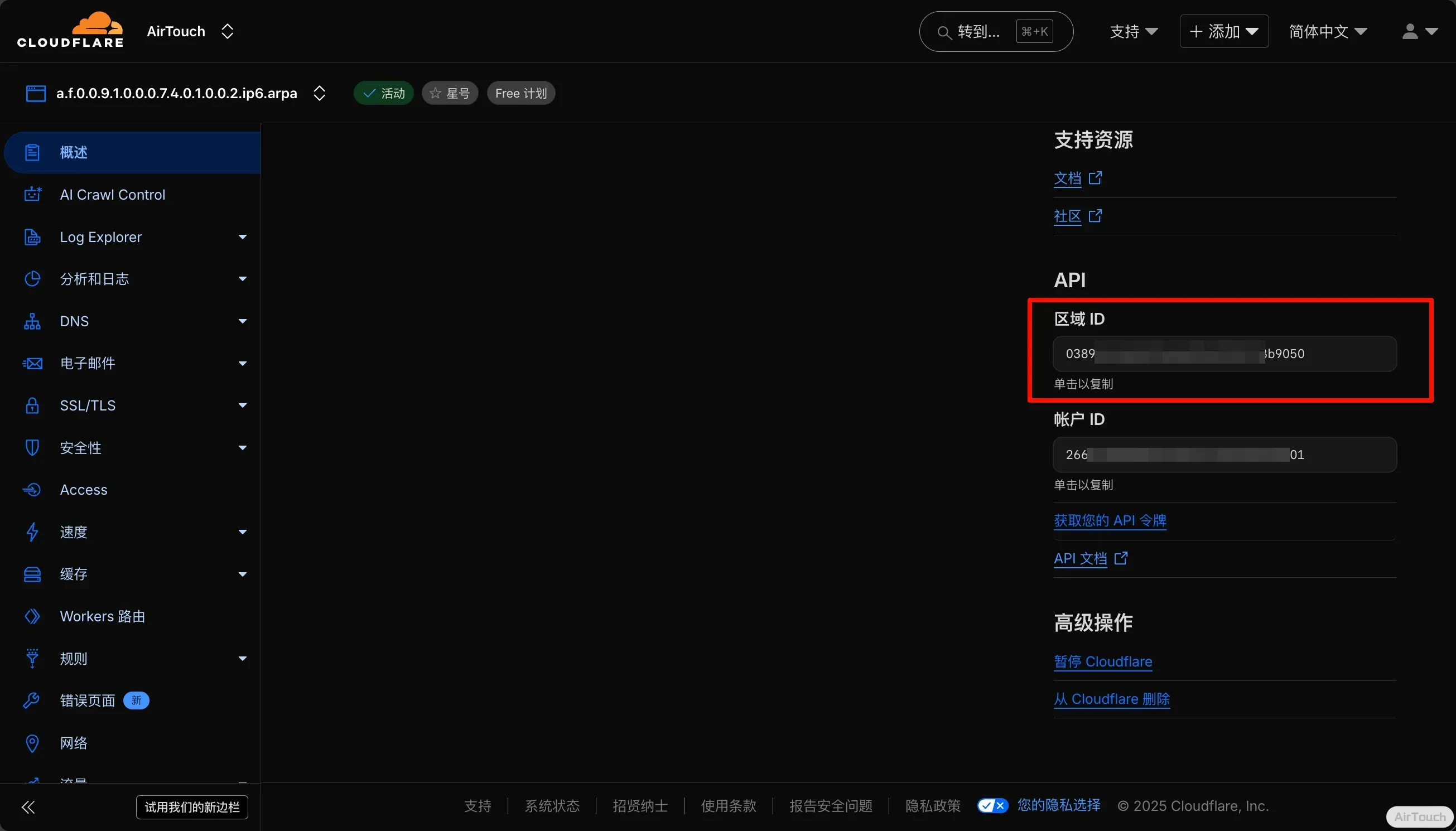 进入你 Cloudflare 中反解域名,向下滑,找到 区域ID,复制下来