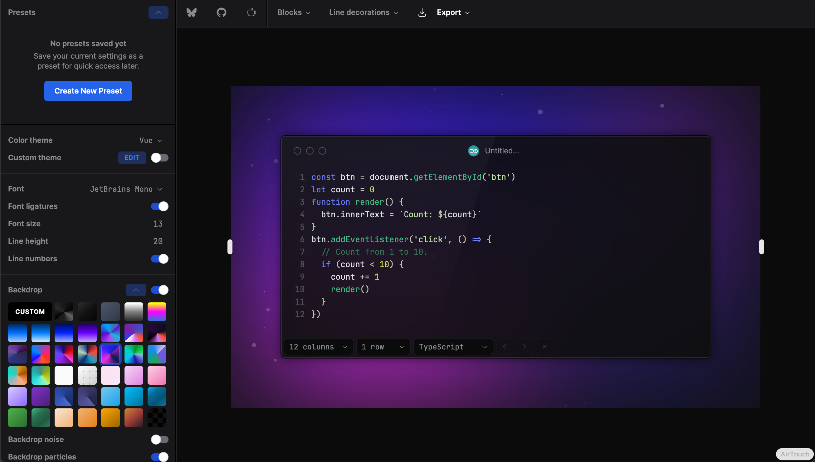 Chalk.ist 是一款开源的代码截图工具,它能将源代码快速转换为风格精美的图片。该工具支持语法高亮、多种主题和自定义样式,您可以直接粘贴代码或导入 GitHub Gist 来生成适用于博客、技术文档、社交媒体或演示文稿的高质量代码图片,极大方便了开发者分享和展示代码片段。